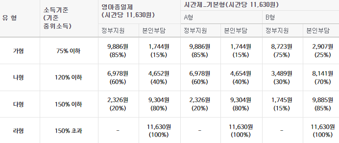 정부 지원을 받기 위해서는 먼저 읍·면사무소나 동 주민센터에서 정부 지원 신청을 하고, 소득유형을 결정받아야 합니다. 이후 지역 서비스 제공기관에 서비스 연계 신청을 할 수 있습니다. 맞벌이 가정(직장 건강보험 가입자) 및 한부모가족지원법에 의해 등록된 취업 한부모가정(직장 건강보험 가입자)의 경우, 복지로를 통해 공인인증서를 사용하여 신청이 가능합니다.