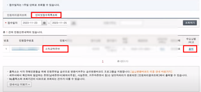 인터넷접수목록조회에서 자신이 신청한 소득금액증명원이 있습니다. 그리고 소득금액증원에 나온 금액을 정확히 12로 나누면 자신의 월평균소득을 확인할 수 있습니다.