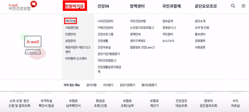 본인이 정해진 월급을 받는 직장인이라면 건강보험공단 홈페이지에서 평균 보수월액을 확인할 수 있습니다. 먼저 국민건강보험 홈페이지에 접속합니다.