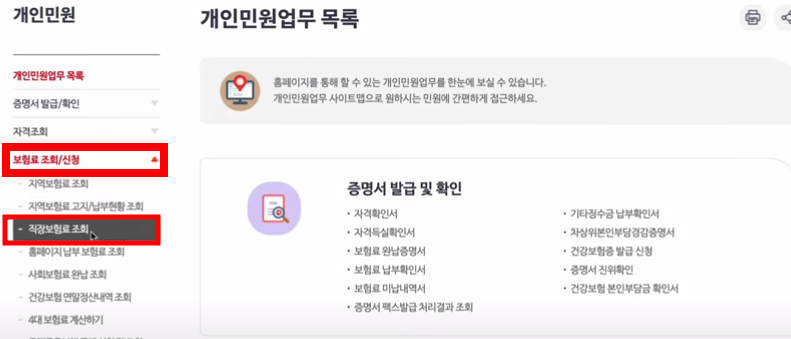 그리고 왼쪽 카테고리에서 보험료 조회/신청에서 직장보험료 조회를 선택합니다.