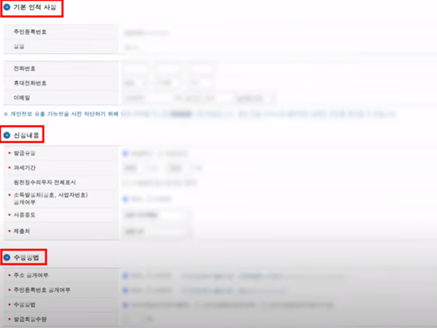 기본인적사항, 신청내용, 수령방법등을 입력하여 신청하기 버튼을 클릭합니다.