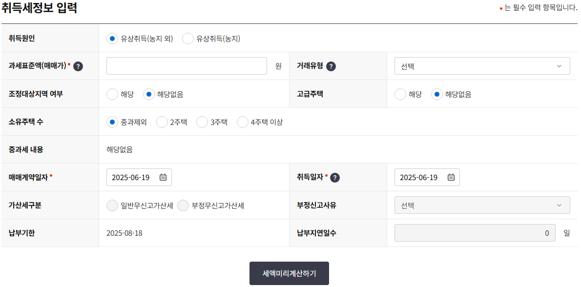 - 주택 취득 목적, 지역, 거래금액, 감면 조건(생애최초, 다자녀 등) 입력