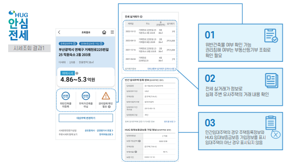 또한, 임대인이 주택도시보증공사(HUG)나 한국주택금융공사(HF)의 보증 가입 금지 여부를 동시에 조회할 수 있습니다. 보증 가입 금지 대상인 경우, 임차인은 이를 사전에 파악하여 더 신중한 결정을 내릴 수 있습니다.