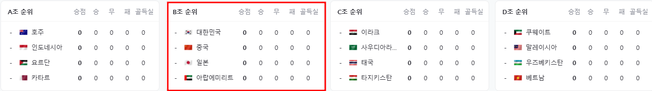 - 대한민국은 지난 대회에서 5위를 차지하여 2포트에 배정되었고, 이에 따라 1포트의 일본, 3포트의 아랍에미리트, 4포트의 중국과 함께 한 조에 속하게 되었습니다. 이러한 조합으로 인해 대한민국은 어려운 경기가 예상되며, 특히 죽음의 조에서의 전투가 예상되고 있습니다.