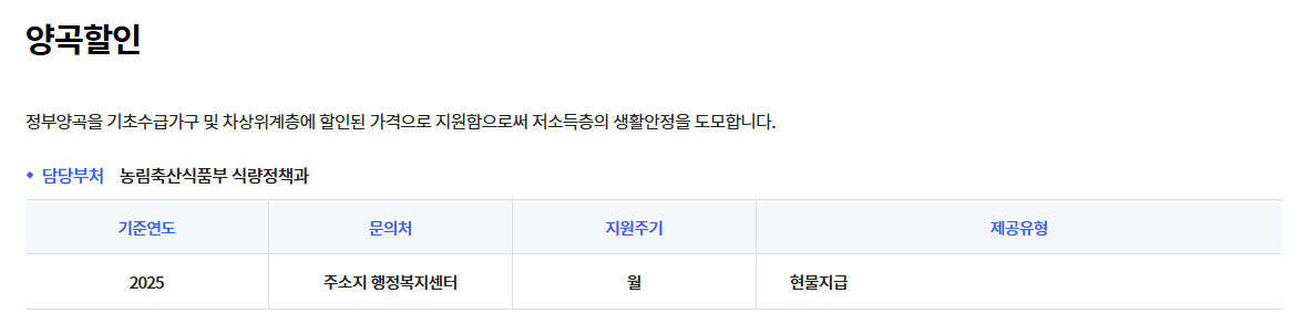 특히 생계급여 수급자는 별도의 신청 없이 자동으로 양곡할인을 받을 수 있으며, 매달 지원금에서 일정 금액이 차감되는 방식으로 편리하게 양곡을 구입할 수 있습니다.
