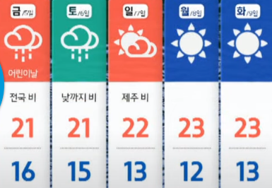 - 5월 5일부터 6일 사이에는 저기압 중심 부근인 경기 북부와 지형 효과가 더해지는 제주도와 남해안 일대에서 시간당 20~30㎜의 강한 비가 예상됩니다. 이 기간 동안 일시적인 강한 바람과 천둥·번개도 동반될 전망이니, 연휴 기간 캠핑 등 야외 활동을 계획 중이라면 급류, 지하차도 침수 등 안전사고에 유의해야 할 것으로 보입니다.