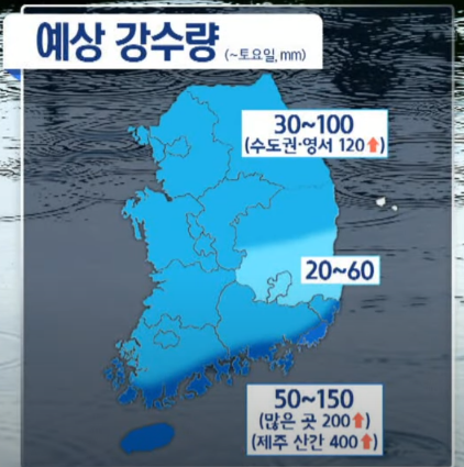 - 기상청의 발표에 따르면, 4일에는 중국 내륙에서 발생한 저기압이 고기압 가장자리를 따라 북동진하면서, 5일 오후부터 제주도와 서해안을 중심으로 약한 강수가 시작될 것으로 예상됩니다. 그리고 5일 밤부터 6일 오전까지 서쪽에서 동쪽으로 강한 비가 쓸고 나갈 전망입니다.