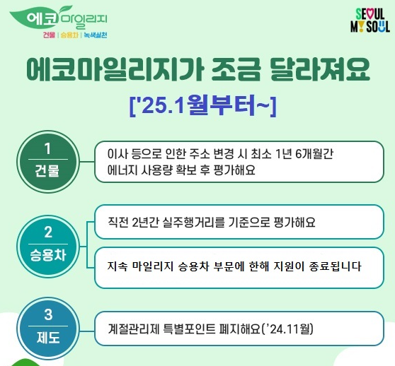 - 에코마일리지는 서울시에서 운영하는 친환경 시민 참여 프로그램으로, 전기·수도·가스 등의 에너지 사용량을 절약하면 절감률에 따라 마일리지를 적립해주는 제도입니다. 이를 통해 탄소 배출량을 줄이고, 지속 가능한 에너지 사용 문화를 확산하는 것이 목적입니다.