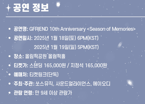 여자친구의 10주년 콘서트 **‘GFRIEND 10th Anniversary Season of Memories’**는 팬들에게 특별한 추억을 선사할 기회입니다. 이번 콘서트는 지난 10년간의 발자취를 돌아보고, 팬들과 함께하는 소중한 시간을 보내기 위해 준비된 자리입니다.