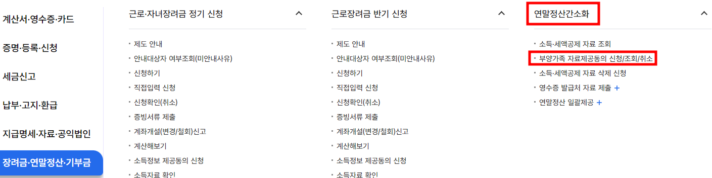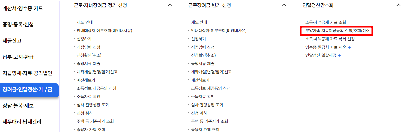 - "부양가족 자료제공 동의 현황 조회" 메뉴를 선택합니다.