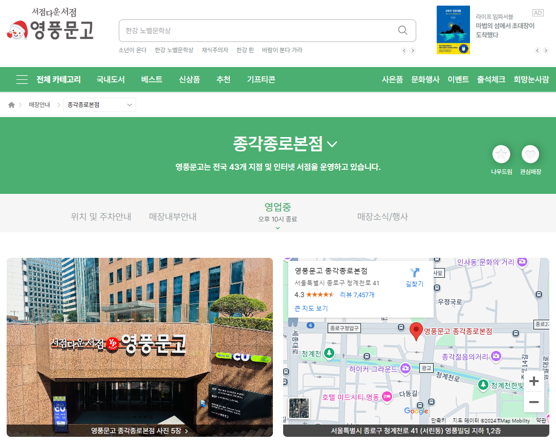 - 방문하려는 매장의 영업시간과 휴무일은 영풍문고 홈페이지에서 확인하는 것이 가장 정확합니다.