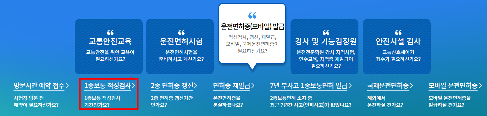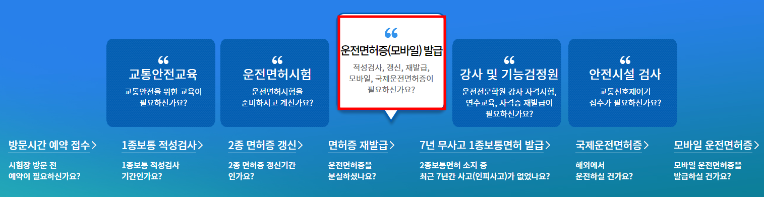 - 메뉴 선택: 메인 화면에서 ‘운전면허발급(적성검사, 갱신, 모바일)’ 메뉴를 선택합니다.