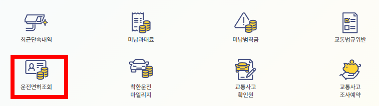 - 하위 메뉴에서 ‘운전면허 조회’ 클릭