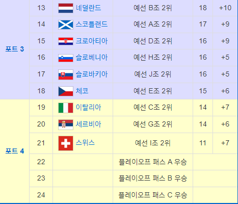포트 4 - 예선전 조 2위 팀 중 8~10위, 플레이오프 통과 3팀
