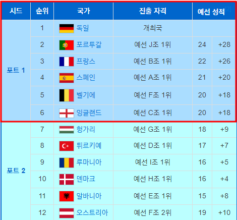 포트 1 - 개최국, 예선전 조 1위 팀 중 1~5위