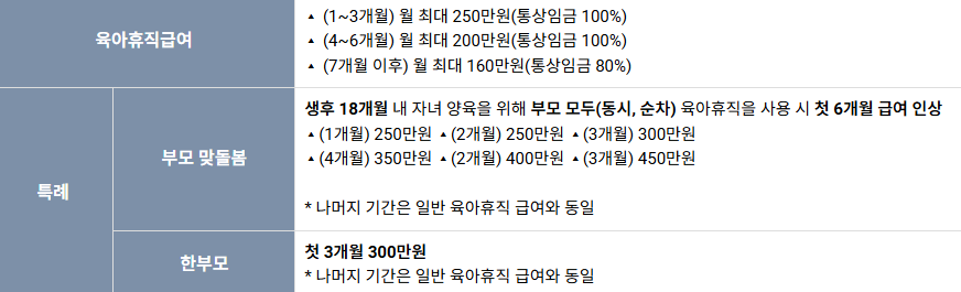 7개월 이후 통상임금의 80% 월 최대 160만원 일반 육아휴직 급여