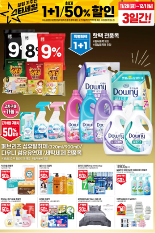 소규모 구매 고객을 대상으로 한 실속 있는 할인 품목이 특징입니다. 예를 들어, 액츠 딥클린 세제를 1+1 행사로 제공합니다.