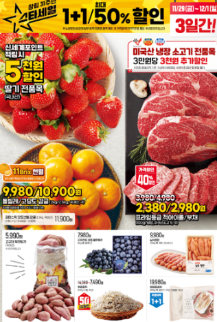 - 제철 과일: 딸기, 고당도 감귤 등 인기 품목이 특별가로 판매