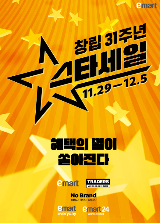 이마트가 창립 31주년을 맞아 대규모 할인 행사 **‘스타세일’**을 진행합니다. 이번 스타세일은 2024년 11월 29일부터 12월 5일까지 7일간 진행되며, 이마트, 트레이더스, 이마트에브리데이, 노브랜드, 이마트24 등 5개 채널이 함께 참여하는 대규모 행사입니다. 특히, 10개의 스타상품을 중심으로 파격적인 할인을 제공해 고객들의 주목을 받고 있습니다.