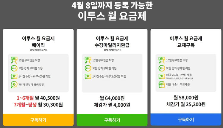 메가스터디나 대성마이맥과 비교했을 때, 이투스 패스는 월 단위로 결제할 수 있어 부담이 적고 해지가 자유롭다는 장점이 있습니다.