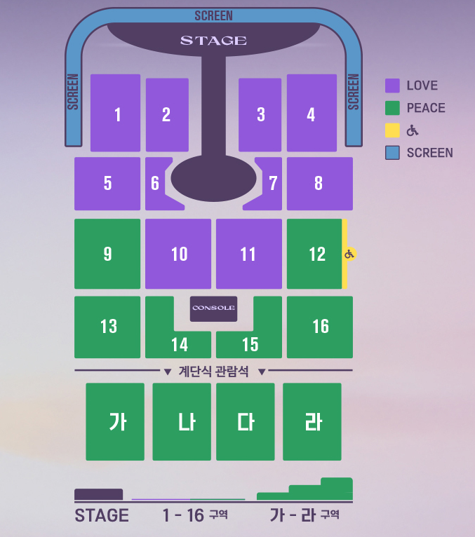 • 앞열: 무대 높이와 스피커 타워 때문에 시야가 일부 가려질 수 있음