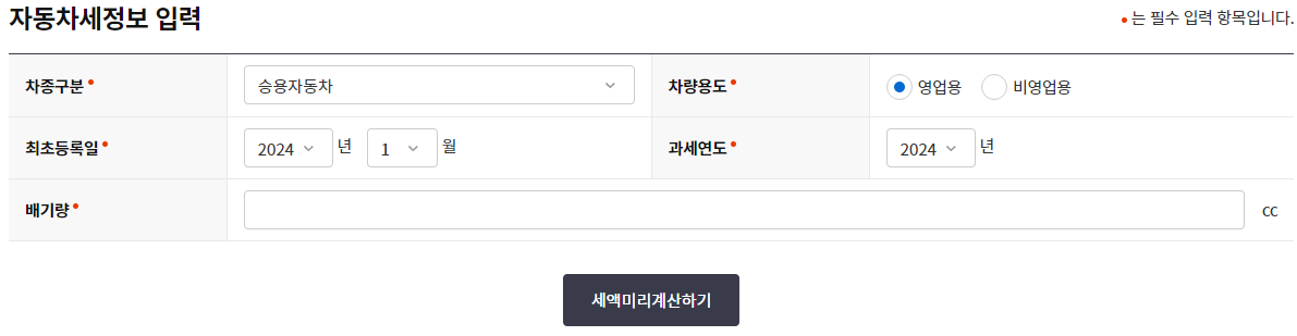 - 조회 결과 확인: 입력한 정보를 기반으로 '세액미리계산'을 실행하여 년간 납부해야 할 자동차세를 확인합니다.