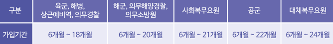 최소 6개월 이상 최대 24개월로 잔여 복무기간이 6개월 이상 남은 자에 한하여 내일준비적금 신규가입이 가능합니다.