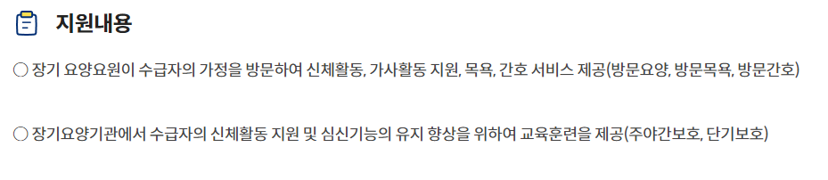- 일정 기간 동안 장기요양기관에서 보호 및 식사, 목욕, 간호 등 제공
