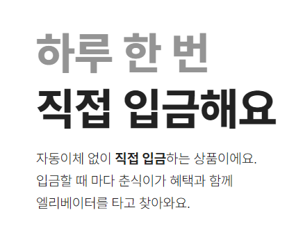 - 또한, 입금할 때마다 귀여운 춘식이가 등장해 한층씩 계단을 올라가는 모습을 보여주어 추가적인 모티베이션을 제공합니다. 31일 만기에 납입한 금액과 이자를 함께 돌려받을 수 있습니다.