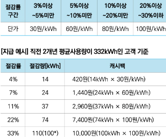 - 참여 방법은 간단합니다. 개별세대가 에너지캐시백에 가입하고, 직전 2개년 평균 대비 전기사용량을 3% 이상 절감한 경우에는 30% 한도 내에서 절감률에 따라 1kWh당 30~100원을 익월분 요금에서 차감하여 지급받을 수 있습니다.