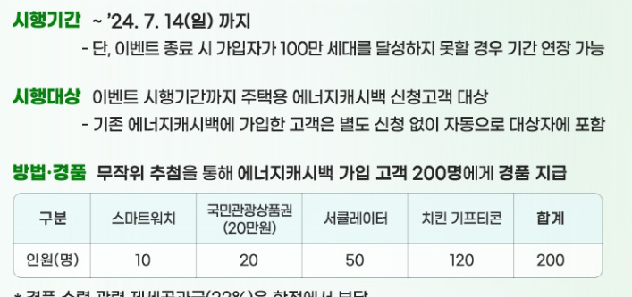 - 에너지캐시백 가입자 대상으로 특별한 이벤트가 돌아왔습니다! 7월 14일까지 가입하는 세대와 기존 가입자 모두를 대상으로, 선착순 200명에게 특별한 선물을 드립니다.