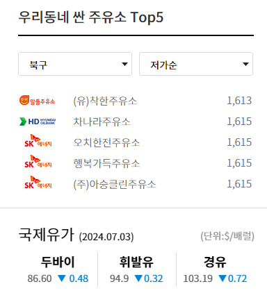 - 가격 비교: 선택한 지역 내 주유소의 가격이 최저가 순으로 정렬되어 표시됩니다. 이를 통해 가장 저렴한 주유소를 쉽게 찾을 수 있습니다.