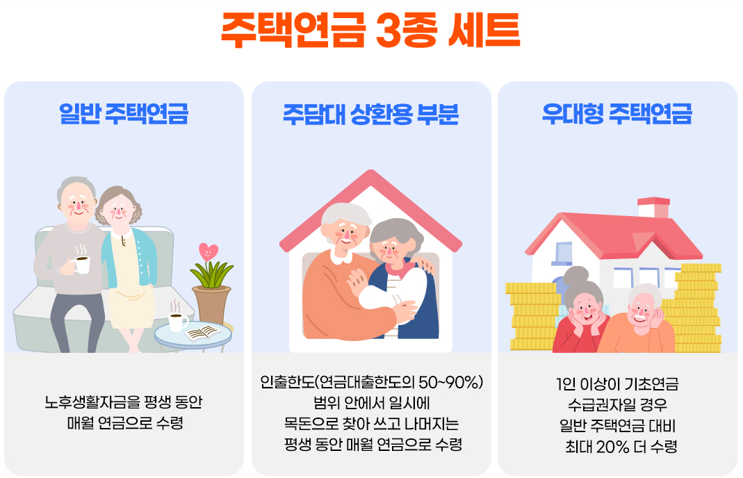 - 설명: 부부 기준 2억원 미만의 1주택 소유자이며, 기초연금 수급권자인 경우 일반 주택연금 대비 최대 21% 추가 수령할 수 있는 방식입니다.