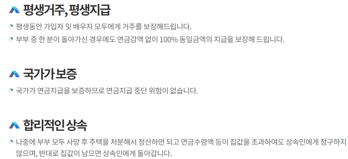 - 설명: 주택을 담보로 하여 매월 평생 동안 연금을 수령하는 방식입니다.