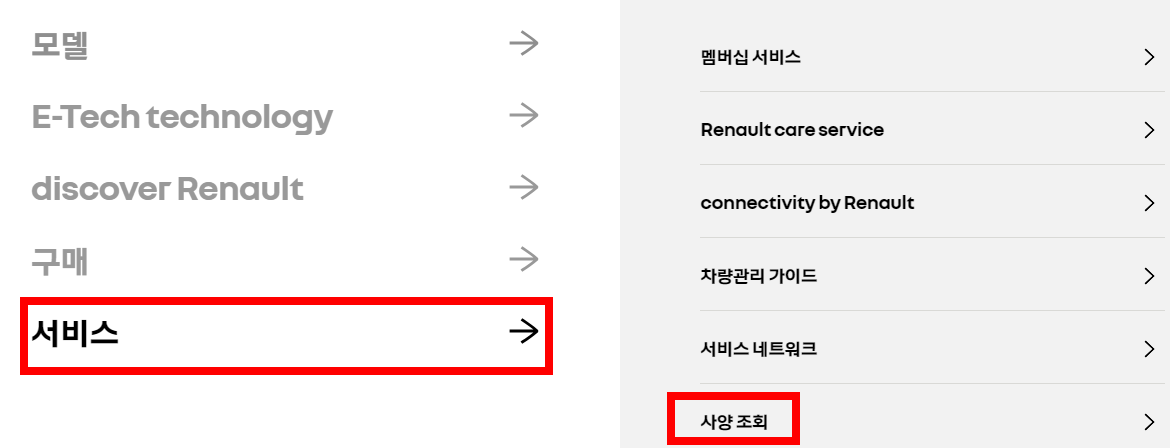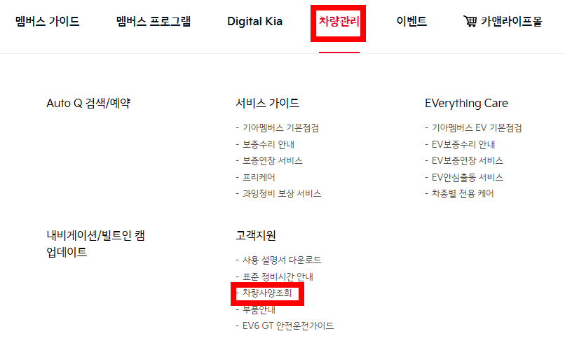 - '멤버쉽&차량관리' 메뉴에서 '사양 조회하기'를 선택합니다.
