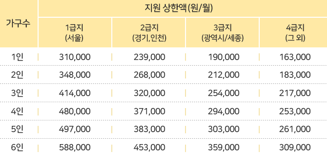 지급기간은 1년이며, 4인가구 기준 서울에 거주한다면 지원 상한액이 월 480,000원을 지급 받을 수 있는 것으로 나와 있으며 적지 않은 금액이므로 본인에게 해당되는 내용을 잘 찾아보시고 혜택을 누리면 좋을 것 같습니다.