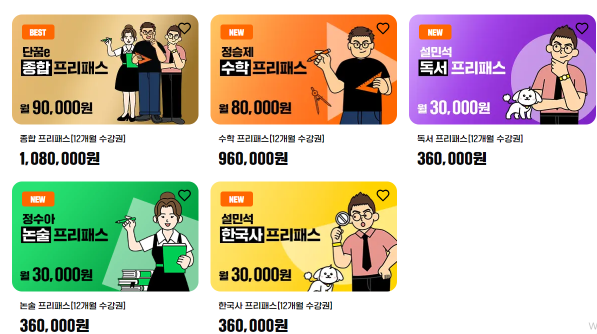 단꿈e는 두 가지 상품 유형을 제공합니다: 종합 프리패스와 과목 프리패스입니다.