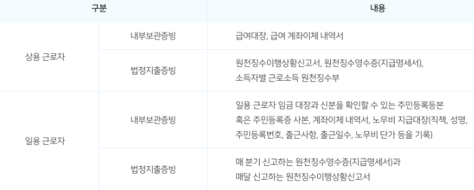 • 인건비를 필요경비로 인정받기 위해서는 원천징수 과정을 거쳐야 합니다. 즉, 원천징수영수증과 원천징수이행상황신고서와 같은 법정지출증빙이 있어야만 합니다.