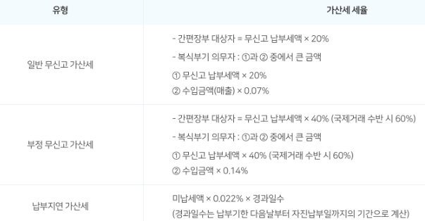 • 세금을 낼 돈이 없다는 이유로 신고를 무시하는 경우, 무신고 가산세를 비롯한 더 큰 금액의 가산세를 부담하게 됩니다. 이러한 상황을 피하기 위해서라도 세금 신고는 꼭 해야 합니다.