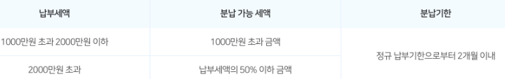 • 납부세액이 1000만 원을 초과하면, 초과하는 금액에 대해서만 정규 납부기한 이후에 나눠 낼 수 있습니다. 예를 들어, 납부세액이 1000만 원을 초과하고 2000만 원 이하일 때는 초과하는 금액에 대해서만 분할 납부가 가능합니다.
