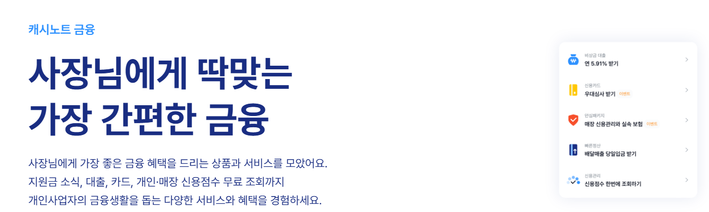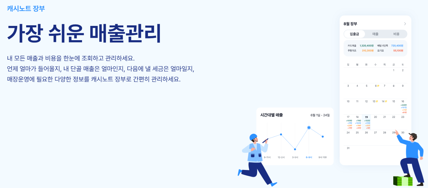 캐시노트는 소상공인과 자영업자를 위한 매출 관리 서비스입니다. 카드 매출, 입금 내역, 정산 금액 등을 자동으로 정리해 주어 사업 운영에 있어 보다 효율적인 관리가 가능하도록 도와줍니다.