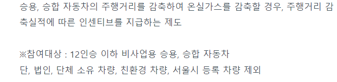 승용, 승합 자동차의 주행거리를 감축하여 온실가스를 감축할 경우, 주행거리 감축실적에 다른 인센티브를 지급하는 제도입니다.