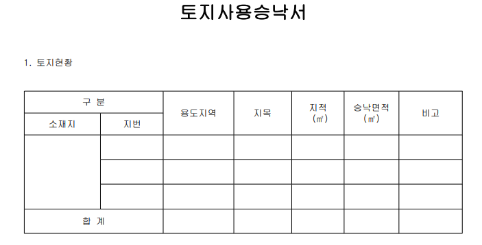 토지사용승낙서 양식은 각 지방자치단체(시청, 군청, 구청) 및 정부 기관에서 제공하는 경우가 많습니다.