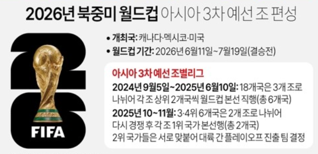 - 18개국이 3개 조로 나뉘어 3차 예선을 치르게 되는 2026 북중미 월드컵 아시아 지역 예선 대회에서는, 본선행 티켓 8.5장 중 6장의 주인공이 결정되는 사실상의 최종 예선이라 할 수 있습니다.
