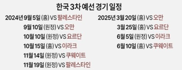 2026 북중미 월드컵 아시아 3차 예선 조추첨 결과 한국, 이라크, 요르단, 오만, 팔레스타인, 쿠웨이트와 함께 B조로 묶여