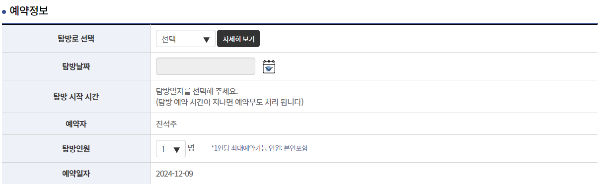 • 탐방 코스, 날짜, 시간, 인원을 선택 후 예약을 완료합니다.