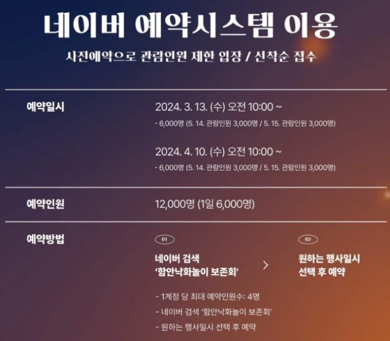 작년 함안낙화축제의 경우 예상 인원보다 2배이상 몰리면서 축제 진행에 차질이 빚어지질 정도록 아쉽다는 평가들이 많아 2024년 함안낙화축제의 경우는 100% 사전예약제로 진행이 됩니다.