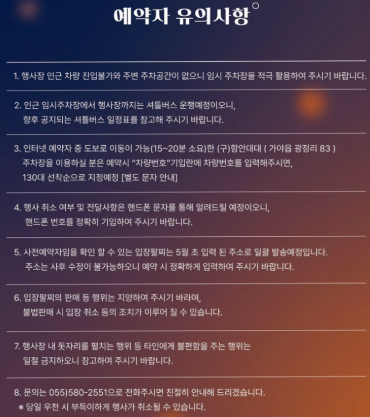 함안낙화축제의 사전 예약부터 행사 관련 내용의 전 과정에 필요한 유용한 내용들을 설명해 드렸습니다. 1차 예약은 아쉽게 마무리 되었지만 2차 예약 일정에 맞춰 꼭 예약에 성공하시어 가족 혹은 친구들과의 소중한 추억을 쌓고 문화적 경험을 풍부하게 하는 이 행사에 여러분 모두가 풍성한 시간을 보내시길 바랍니다.