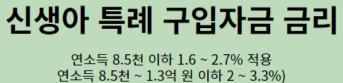 그리고 청약 저축 통장 가입 5년 이상 0.3%p, 10년 이상 0.4%p, 15년 이상 0.5%p 우대금리가 적용이 됩니다. 연 소득 8,500만 원 이하 대출 금리는 대략적으로 2% 전후 금리가 예상이 되며, 연소득 8,500만원 ~ 1.3억 원 이하는 2.5% 전후 금리가 예상이 됩니다.