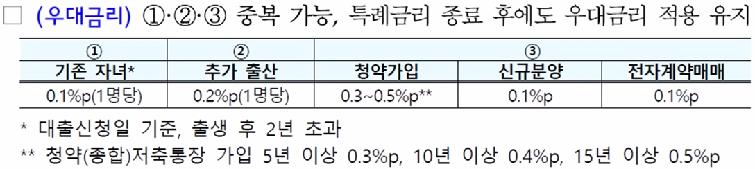 ex) 23.1월에 첫째 출산 후 대출 실행 시 24. 12월에 둘째 출산 시 우대금리 0.2%p, 특례 금리 적용기간 5년 연장 제공